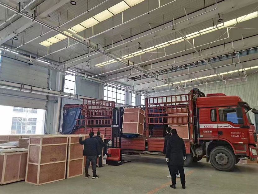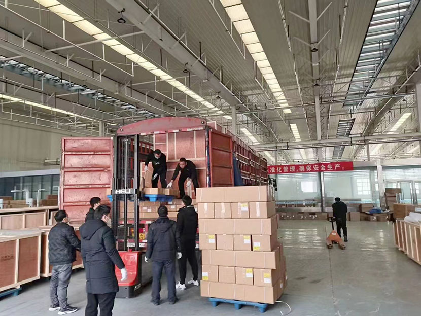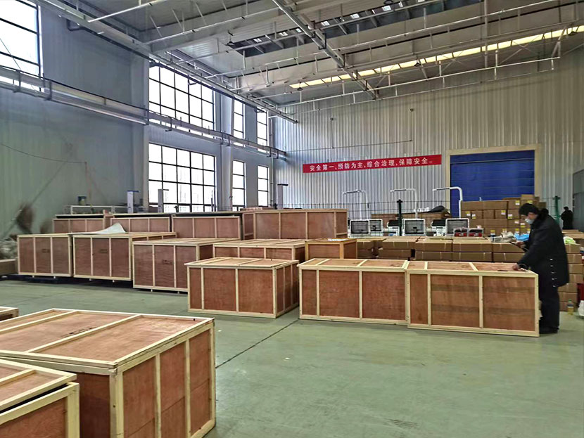 每一臺體檢機都由獨立大型木質包裝箱嚴格密封,以此保證運輸過程中設備完好,順利抵達客戶端。昨天,工人們正在加班裝車搬運中....